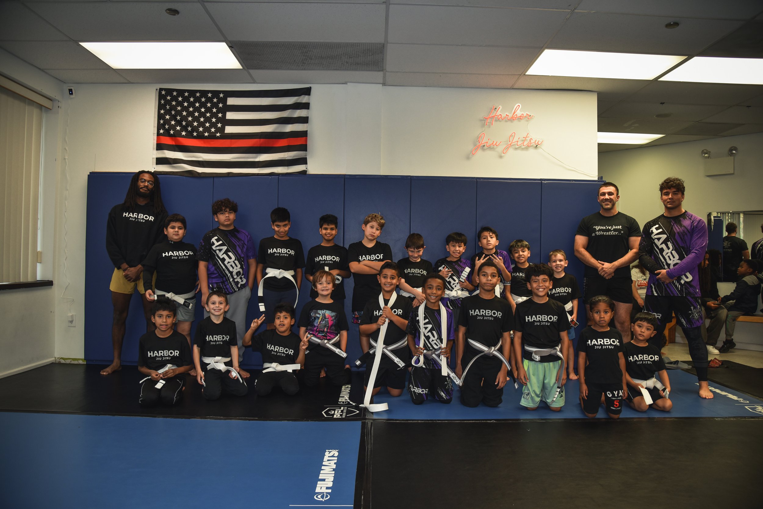 All students are required to wear Harbor Jiu Jitsu apparel for the upper body during classes. A complimentary t-shirt is provided at sign-up.